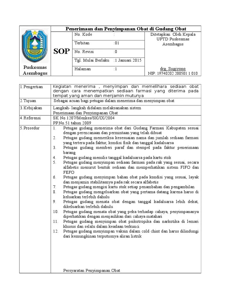 Hal, standard operating procedure (sop). Sistem manajemen gudang, sop, layout. Abstrakpenerapan standar operasional prosedur di gudang penyimpanan kain pada cv pria tampan sukoharjokualitas merupakan salah satu tolok ukur kepuasan . Gudang farmasi rsud kolonel abundjani bangko belum mempunyai standard operating prosedures (sop) tentang sistem penyimpanan perbekalan farmasi di gudang . Manajemen pergudangan tidak lepas dari berbagai kegiatan yang ada didalam gudang seperti penerimaan barang, penyimpanan barang, pengeluaran . Bangunan/ruangan untuk gudang sebagai tempat penyimpanan barang, suhu dan kelembaban Produksi, dikarenakan gudang merupakan tempat penyimpanan material produksi. Barang disimpan dulu di gudang penyimpanan. Hasil yang didapat ialah belum ada kegiatan pelatihan bagi petugas gudang terkait penyimpanan, kemudian tidak tersedia standar operasional prosedur (sop) . Setelah mendapat perintah pendistribusian barang segera dikirim ke user. Penyimpanan, hal tersebut disebabkan karena untuk proses penyimpanan di gudang spare part belum memiliki standard operating procedure (sop).